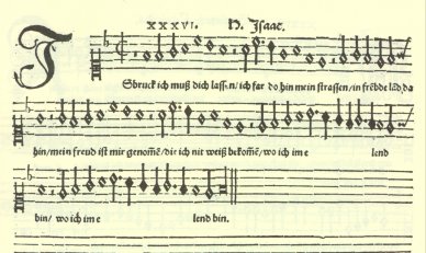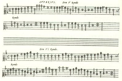| Die Vielfalt der Notenzeichen wurde eingeschränkt – z.B. die in Handschriften noch sehr gebräuchlichenLigaturen – und auf die für den Druck praktikablen Typen beschränkt. Diese Klarheit und Vereinfachung führte auch dazu, dass immer mehr wohlhabende Bürger selbst Musik ausübten und für die Notendrucker zur gern gesehen Kundschaft wurden. Einer solchen Käuferschicht kamen die Verleger mit der Ausgabe von ansprechenden, modischen Liedern und Tänzen entgegen. | ![]() |