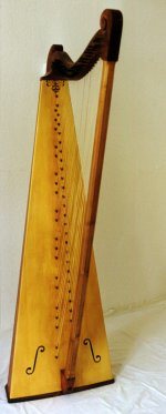 | Mit dem Entdecken neuer Klangwelten in der Musik des 16. Jahrhunderts wurde es für den Instrumentenbau unerlässlich, nach Möglichkeiten zu suchen, den Gebrauchstonvorrat zu erweitern, zunehmend mehr Halbtonschritte waren nötig, bis gegen Ende des 16. Jahrhunderts war eine – wenn auch eingeschränkte – Chromatik gefordert. So wurden auch Möglichkeiten gesucht, die Harfe diesen Erfordernissen anzupassen, in Italien entstand die „harpa doppia“, mit parallel geführten diatonischen und chromatischen Saiten, bei der spanischen Harfe durchkreuzen sich diatonische und chromatische Saitenreihe. Die spanische Harfe, nach etwa 1550 in Spanien entstanden, besticht durch ihren auch bei tiefen Tönen vollen, sonoren Klang.Ebenso wie die gotische Harfe ist dieses Instrument in mehreren Programmen des Ensembles zu hören. |