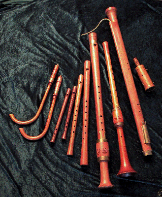| Wir möchten hier einen Einblick in die Instrumentenwelt des Ensembles geben. Die nebenstehende Abbildung zeigt eine Auswahl an Blasinstrumenten: Krummhörner, Blockflöten, (Alt-) Pommer, Dulzian und Rankett. Von allen diesen Instrumenten besitzt das Ensemble ein vom Bass bis zum Diskant vollständiges Quartett. Von beinahe allen geläufigen Instrumenten, die im Wesentlichen seit dem 15. Jahrhundert in Gebrauch waren, wurden im Verlauf des 16. Jahrhunderts ganze „Stimmwerke“ gefertigt, um dem neuen Ideal eines homogenen Klangkörpers gerecht zu werden. Solche Instrumentenfamilien finden wir in dem bemerkenswerten „Syntagma Musicum“ des Michael Praetorius, einem enzyklopädischen Werk über die Musik, geschrieben zu Beginn des 17. Jahrhunderts. Der Autor erörtert aus der Sicht des Musikers und Kapellmeisters für uns heute aufschlussreich, fundamentale instrumentenkundliche und aufführungspraktische Fragen. | ![]() |